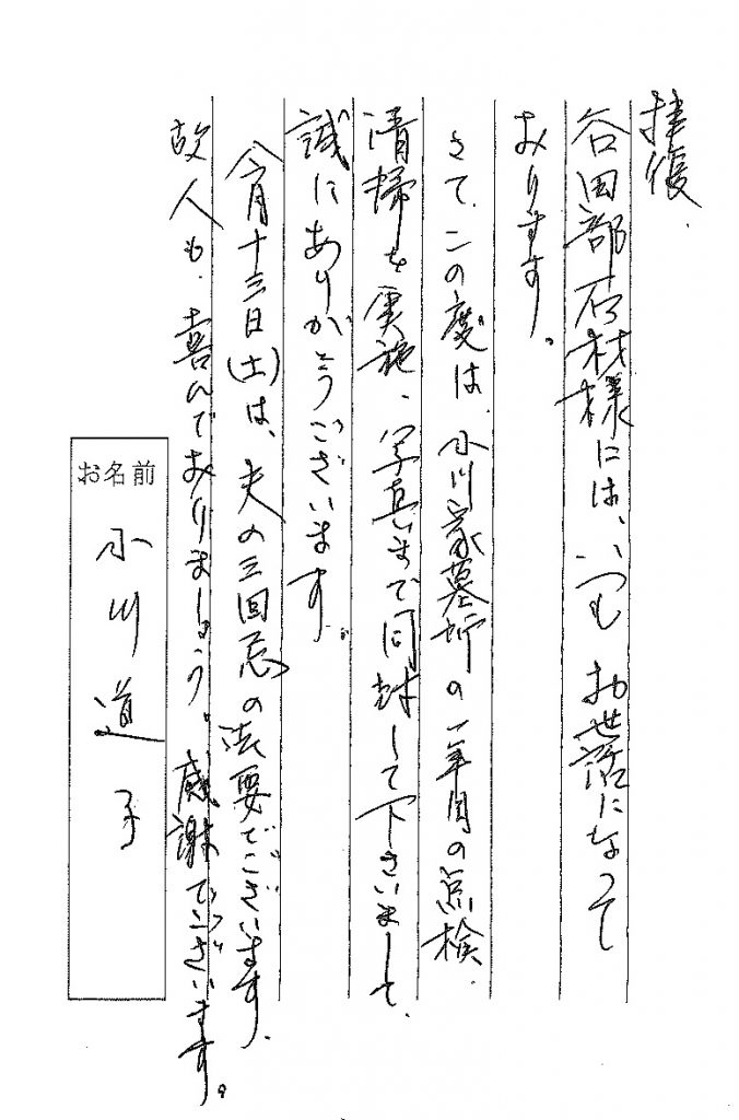 宇都宮市 多氣山霊園に墓石を建立された小川様からのお手紙