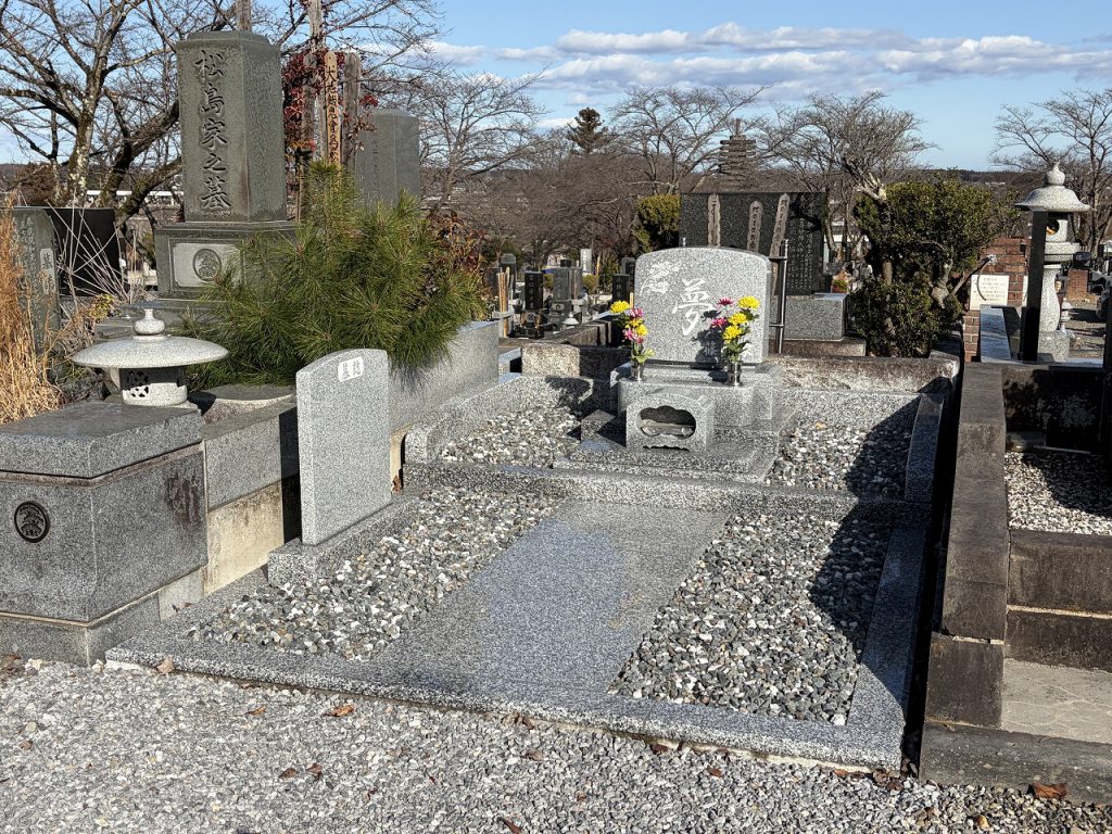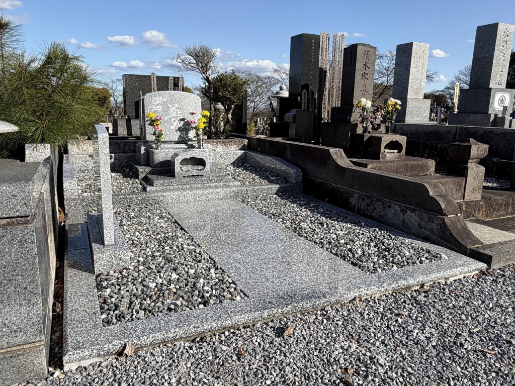 外柵には落ち着いた色合いの新青葉石を使用し、石塔には上品な風合いの新清明石を合わせた、すっきりとしたモダンなデザインのお墓です。広い区画を活かし、ゆとりと開放感のある佇まいに仕上がっています。