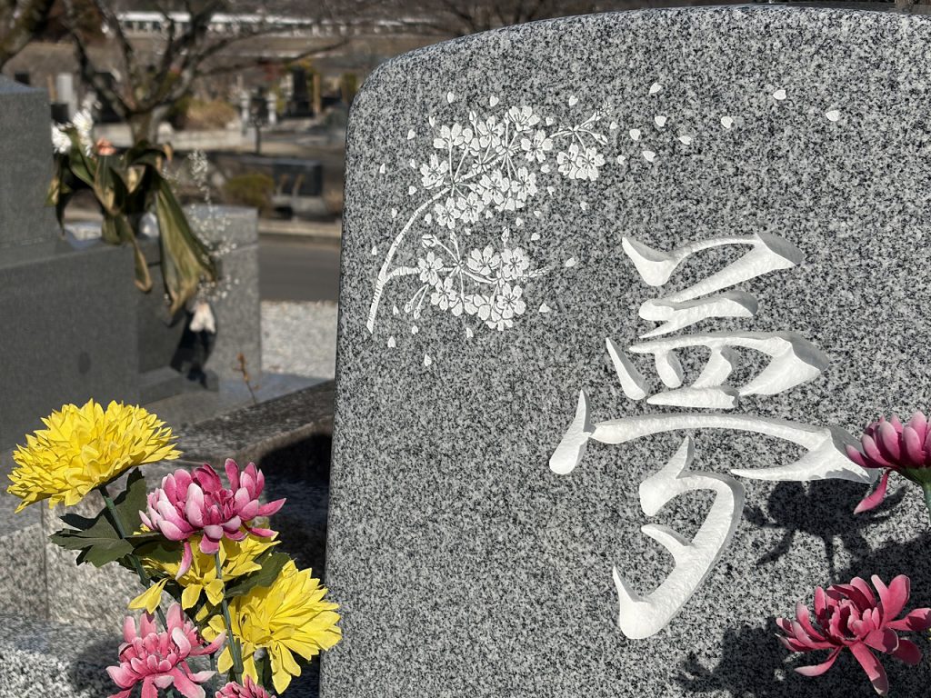 墓石正面には「夢」の大きな文字を刻み、その周りに桜の彫刻を施しました。やわらかな桜の意匠が、想いのこもった文字を優しく引き立て、温かみのある表情をつくり出しています。
