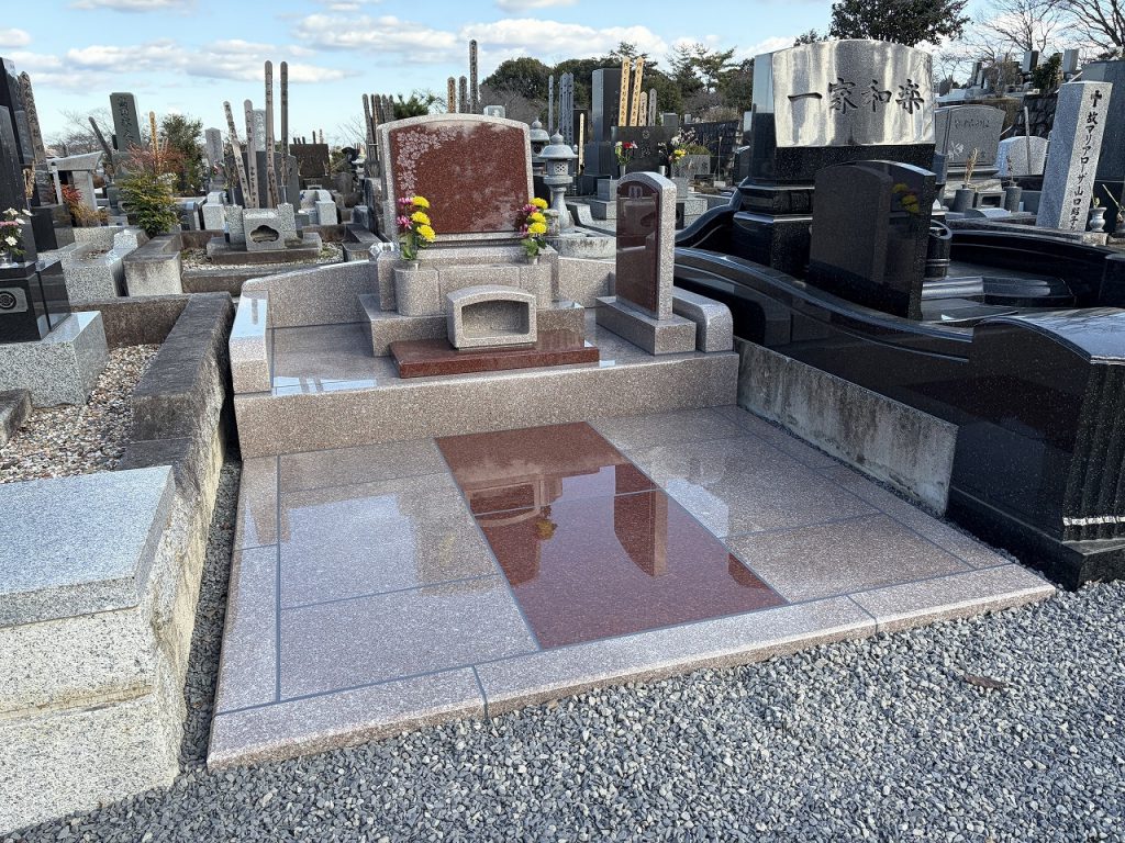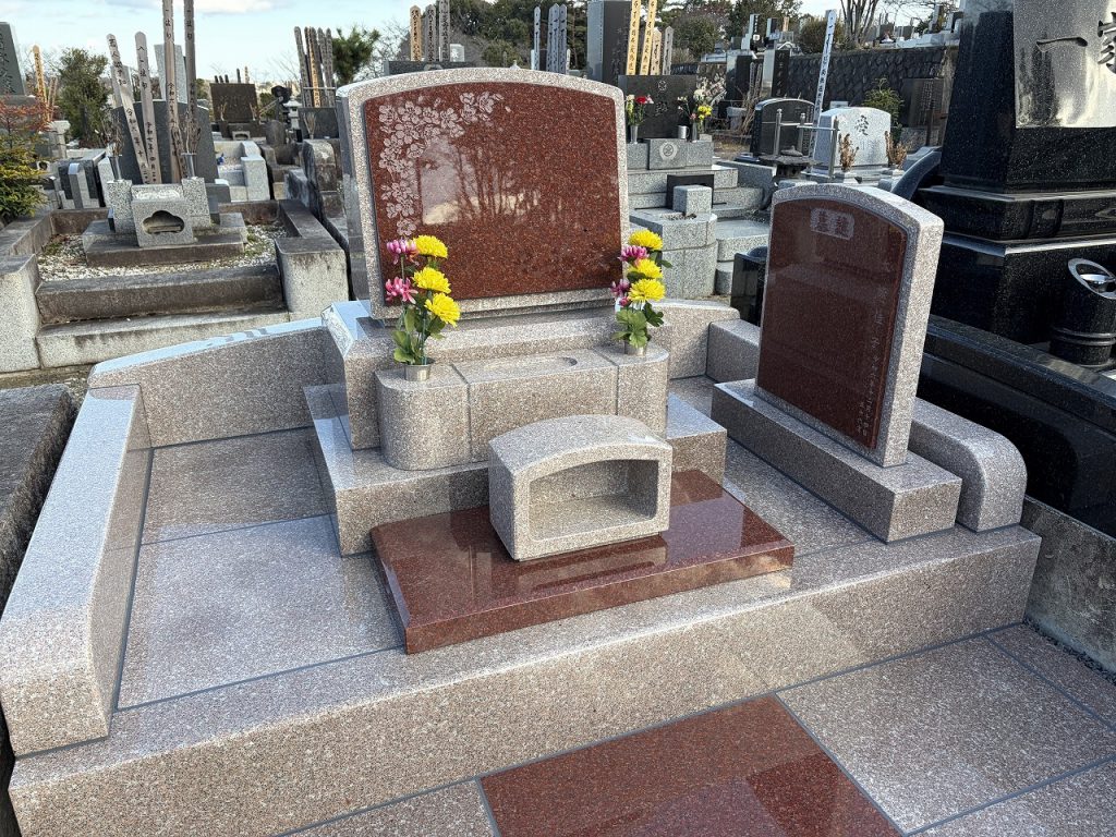 落ち着きのある気品と重厚感を兼ね備えた「ニューインペリアルレッド」を基調に、やわらかく優しい色合いの桃色御影石「G663」を組み合わせた、上品で温かみのあるデザインに仕上げました。深みのある赤と淡いピンクのコントラストが美しく、周囲の景観にも調和しながら、ひときわ存在感を放つお墓です。