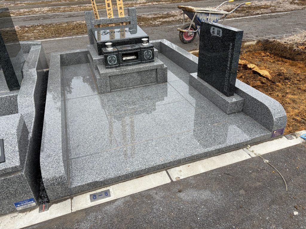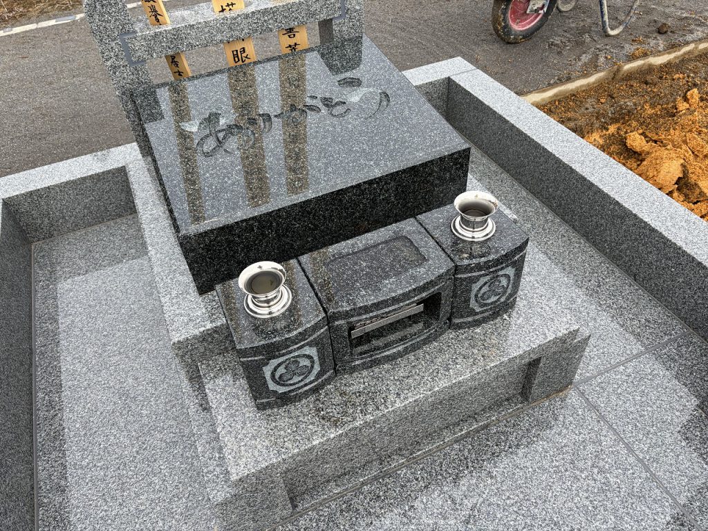 重厚感とデザイン性を兼ね備えた、シンプルでありながら個性の光る一基です。 ご家族が心穏やかにお参りできる、温かみのある空間づくりを大切に施工いたしました。