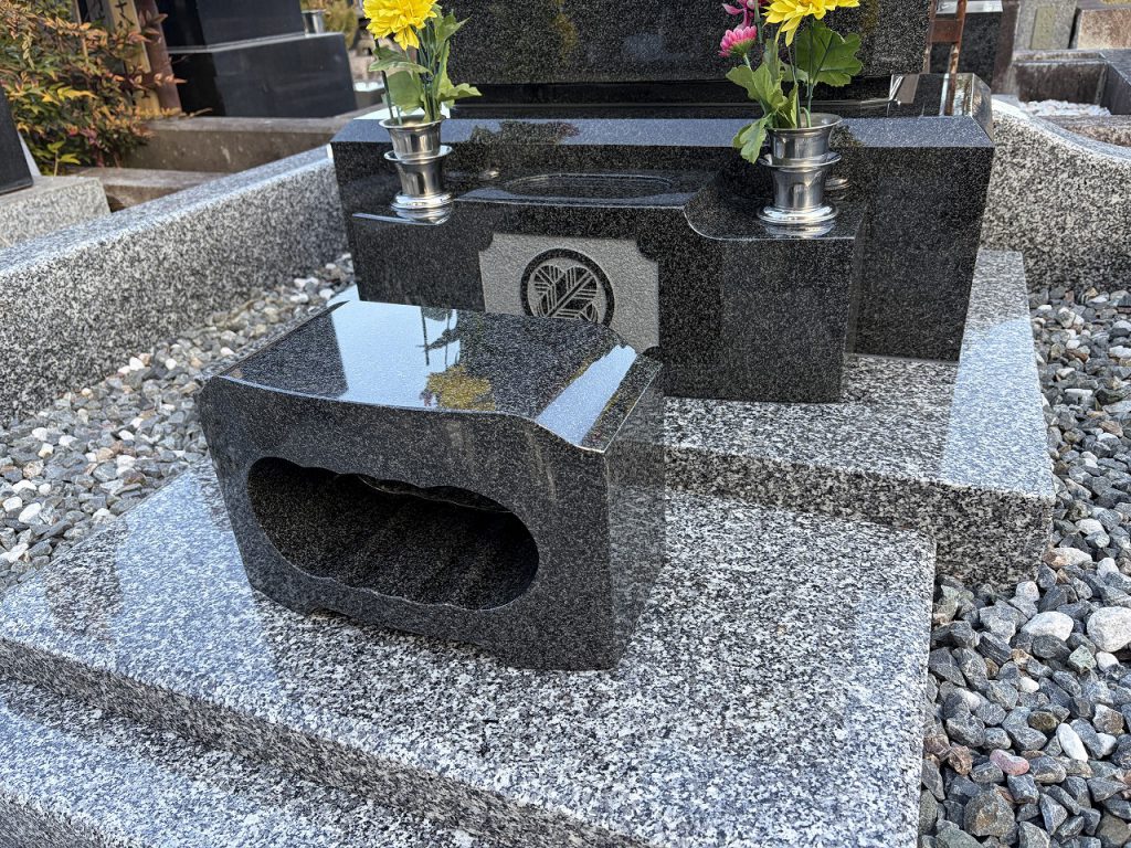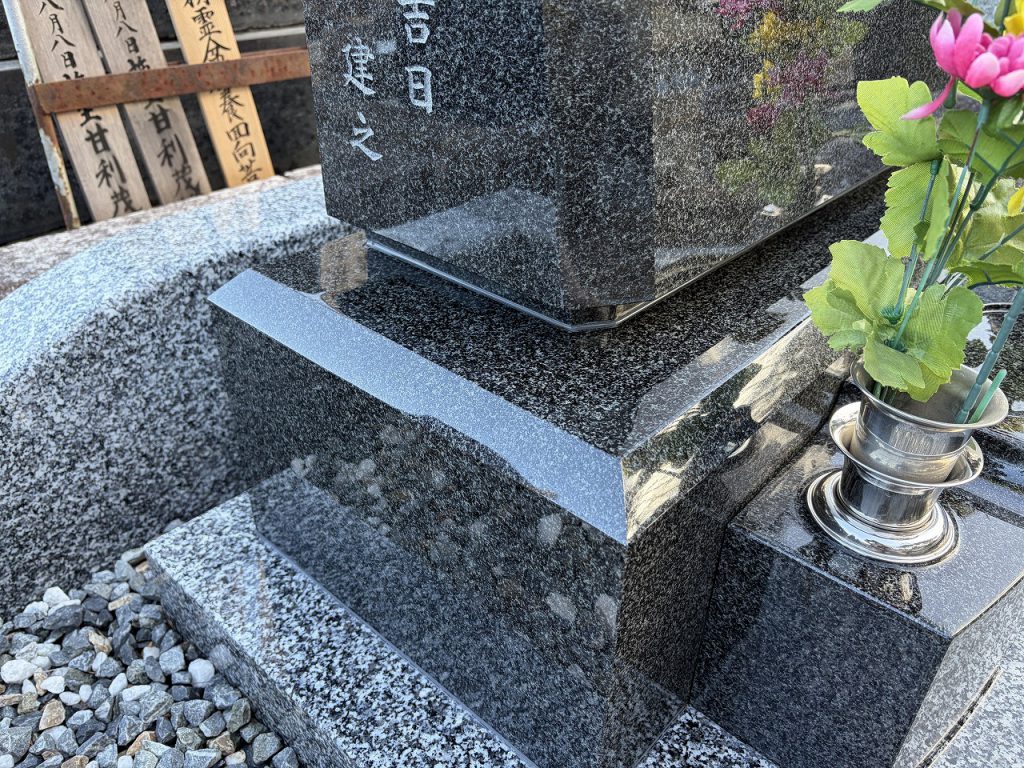 きめの細かい石質が特徴のため、正面文字や家紋もくっきりと美しく彫り上がり、存在感のある仕上がりとなっています。細部にまでこだわり、丁寧に施工させていただいた一基となりました。これからも末永く、ご家族の心の拠り所として寄り添ってくれることでしょう。